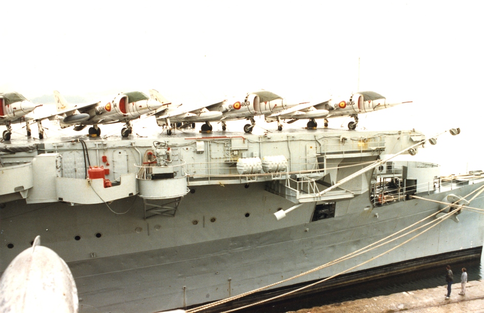 Aunque en un principio sirvió como portahelicópteros, el 8 de noviembre de 1972 un avión Harrier STOVL (despegue corto/aterrizaje vertical) efectuó con éxito una serie de pruebas sobre su cubierta, convirtiéndose así en el primer buque que recibía este tipo de aeronaves. En Diciembre de 1973 la llegada de 8 Harrier comprados a EE.UU. conformaba la creación del núcleo de combate aéreo de la Armada Española. Ha sido el primer portaaeronaves del mundo en llevar normalmente aviones Harrier en su dotación de aeronaves.
