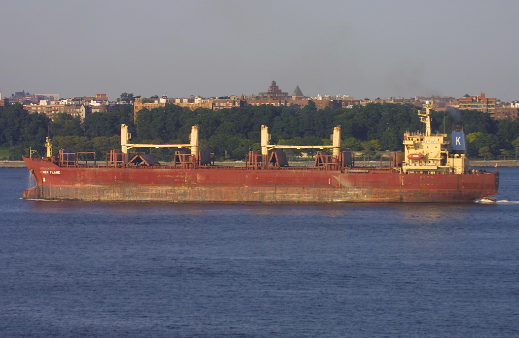 El New Flame, de bandera panameña, según ha precisado López Garzón, porta 700 toneladas de fuel y 50 toneladas de diésel, además de su cargamento de chatarra, y permanece encallado, apoyado en el fondo marino con la proa sumergida y la popa fuera del agua.