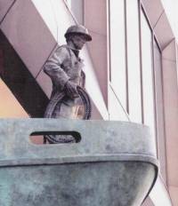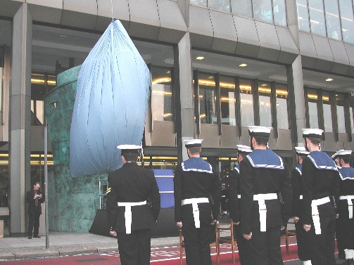 El monumento, de siete metros de altura, diez toneladas de bronce representando la proa de un barco carguero con un solo marino en cubierta, es el trabajo del internacionalmente renombrado escultor Michael Sandle.