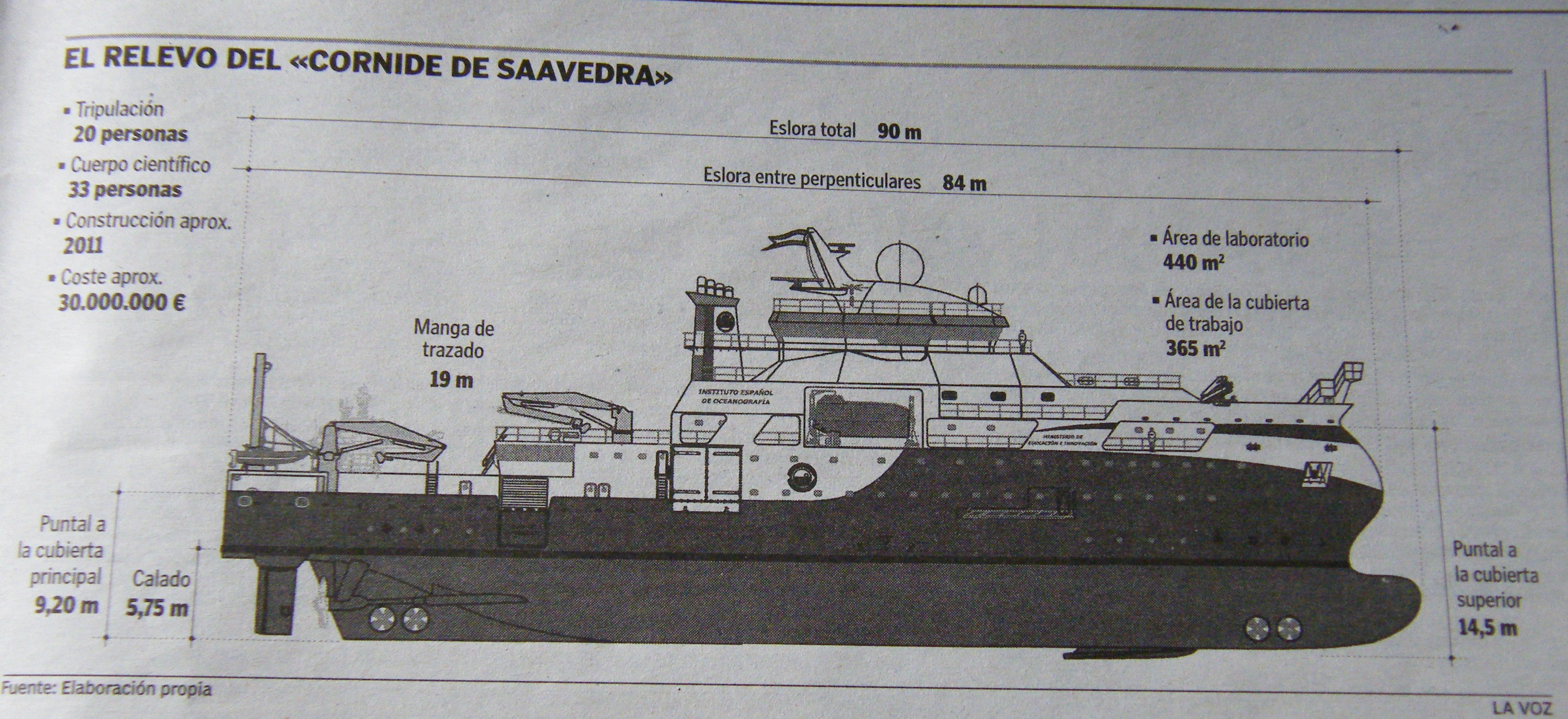La embarcación será la mayor de todas las que componen la cada vez más extensa flota de buques oceanográficos. Incluso por delante del Hespérides , que mide 83 metros de eslora, pero que será, sin embargo, el único con capacidad global, ya que dispone de una proa acorazada que le permite adentrarse en los casquetes polares y dar servicios a las dos bases españolas en la Antártida. El coste de esta futura plataforma científica flotante se estima en unos 30 millones. Su puesta en funcionamiento se aguarda para el 2012, ya que, de momento, el proceso está en sus fases preliminares. Falta redactar el proyecto final, el concurso público y luego su adjudicación. Finalmente empezará la construcción, con no menos de año y medio por delante.
